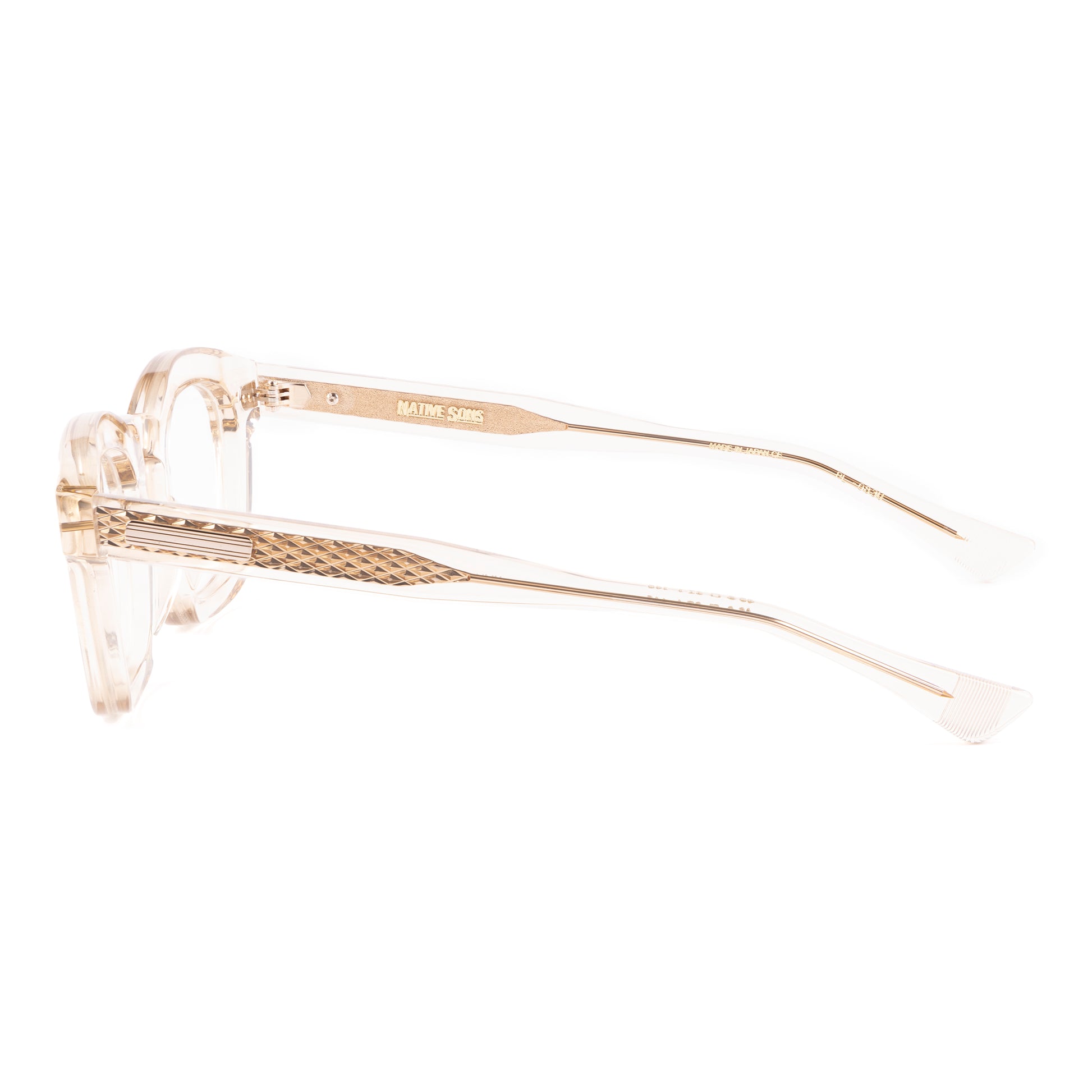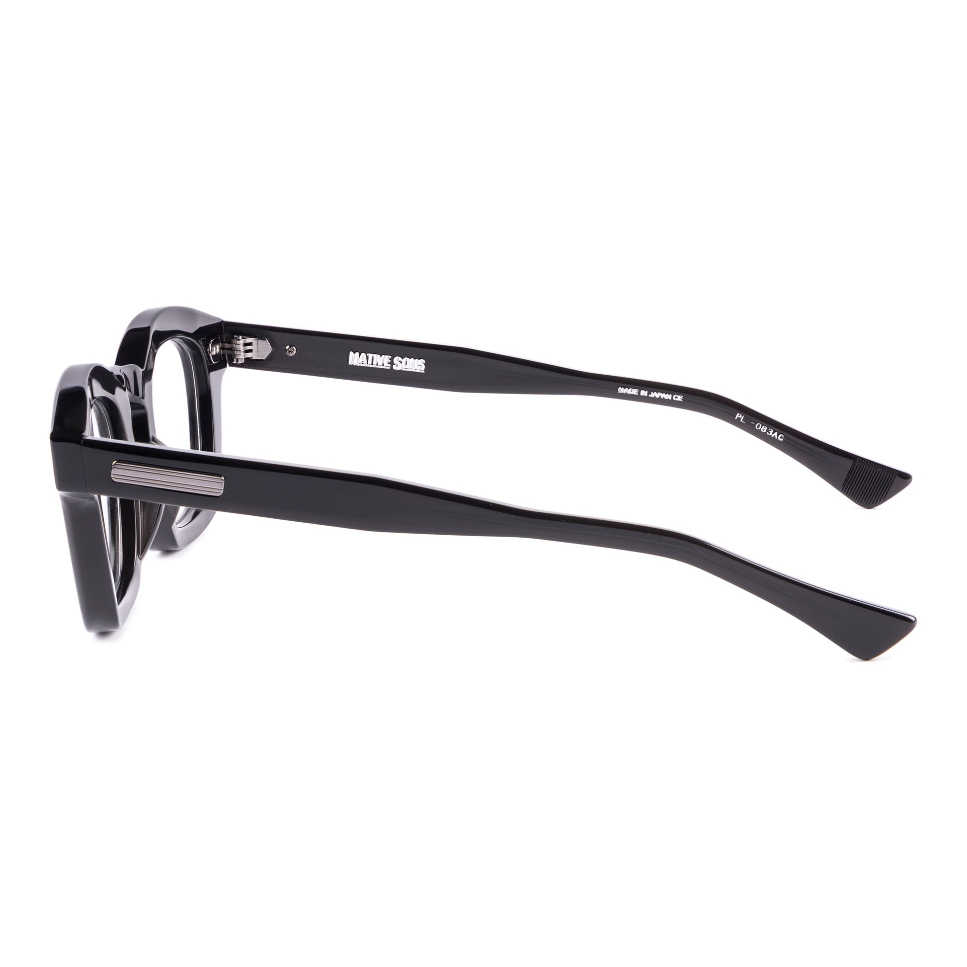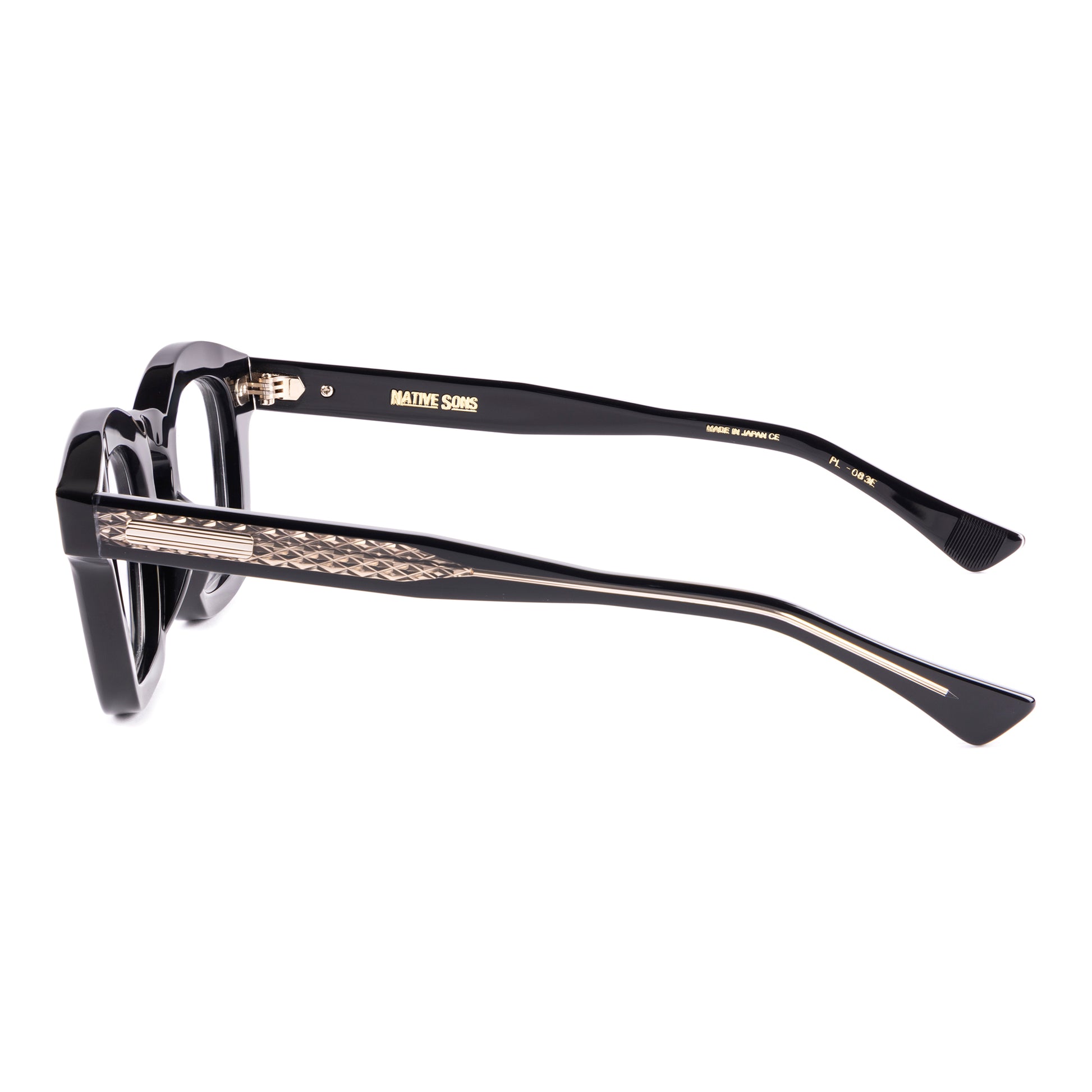 テンプルは後方に向かって四角くなり、形を整えながら耳に沿うように上下のバランスの違う テーパーラインを描いている。