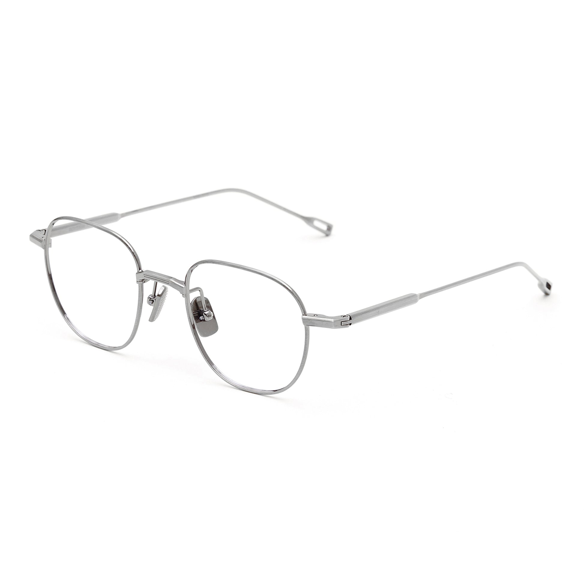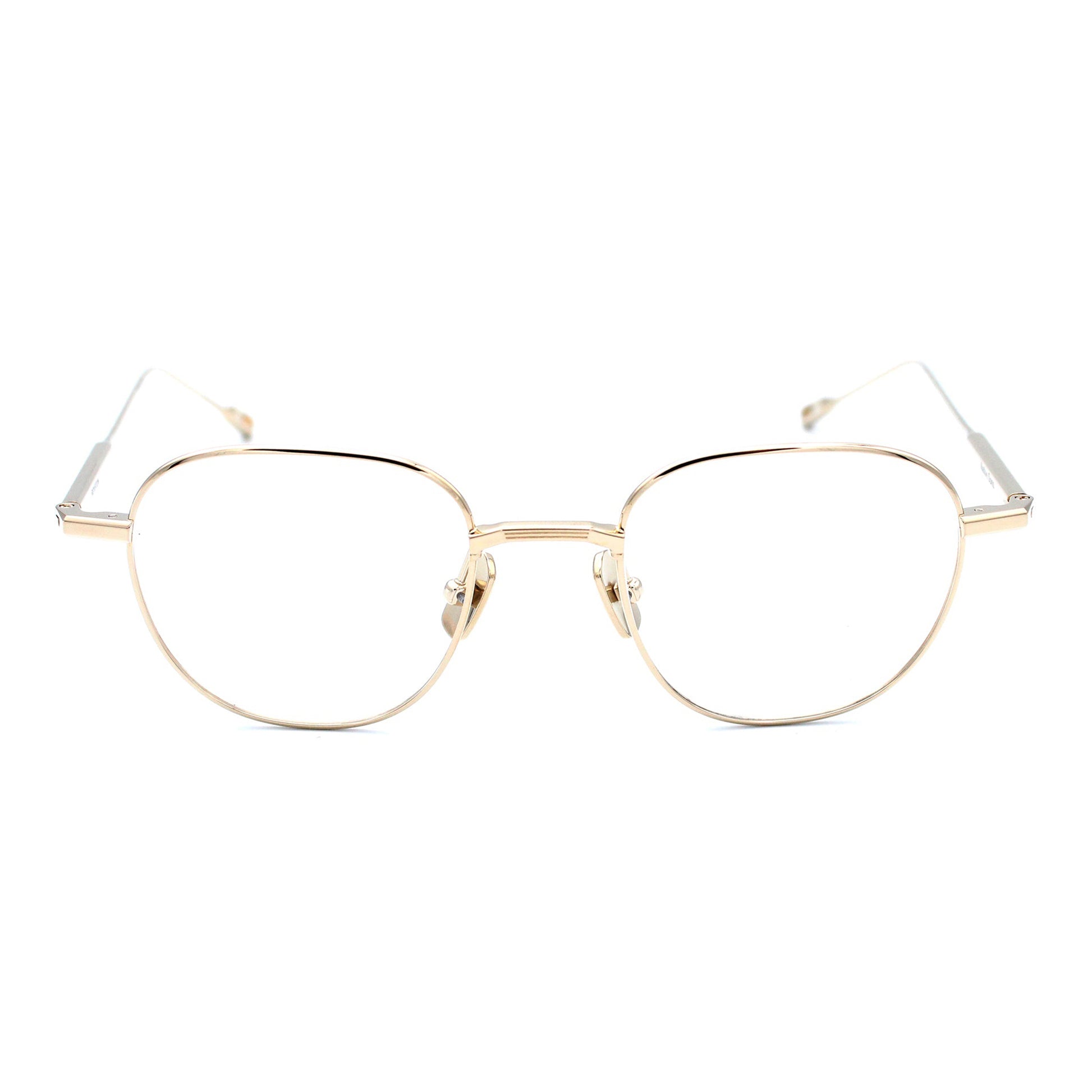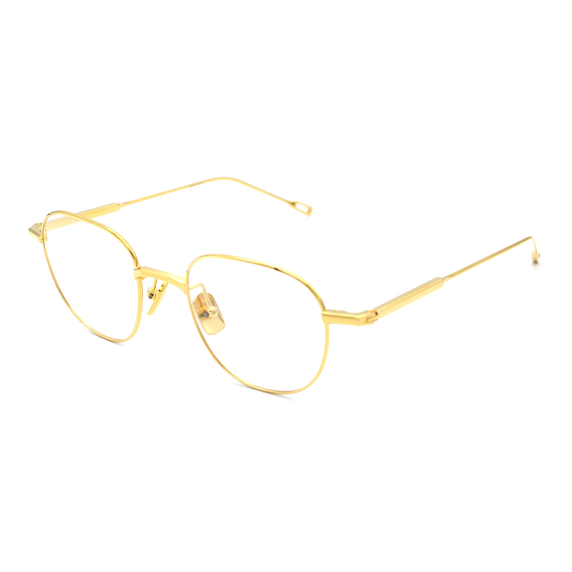 紳士的かつクリーンな印象を与える。 超軽量なストロベリー型のフレームはシームレスに多様な骨格に合う。 カシメ部分で開閉する半円のリムストック。80年代のAMステレオからインスパイアされた立体的なデザインのノーズブリッジとテンプルコネクションにも線のエッジングが施されている。